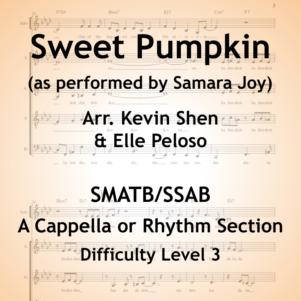 "Sweet Pumpkin" is based on the performance by Grammy-winning singer Samara Joy, celebrating her powerful vocal control and technical riffs. This arrangement is full of fast runs and creative melodic embellishments that will get the whole group in the swinging groove. It can be performed both a cappella or with rhythm section.